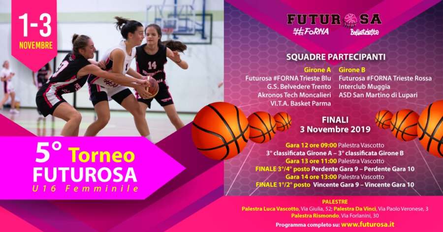 La manifestazione, organizzata dalla ASD Futurosa #Forna Basket Trieste è giunta quest’anno al suo 5° appuntamento, vedrà sfidarsi a partire da venerdì 1 novembre e fino a domenica 3 sette formazioni under 16 che si contenderanno la vittoria finale.