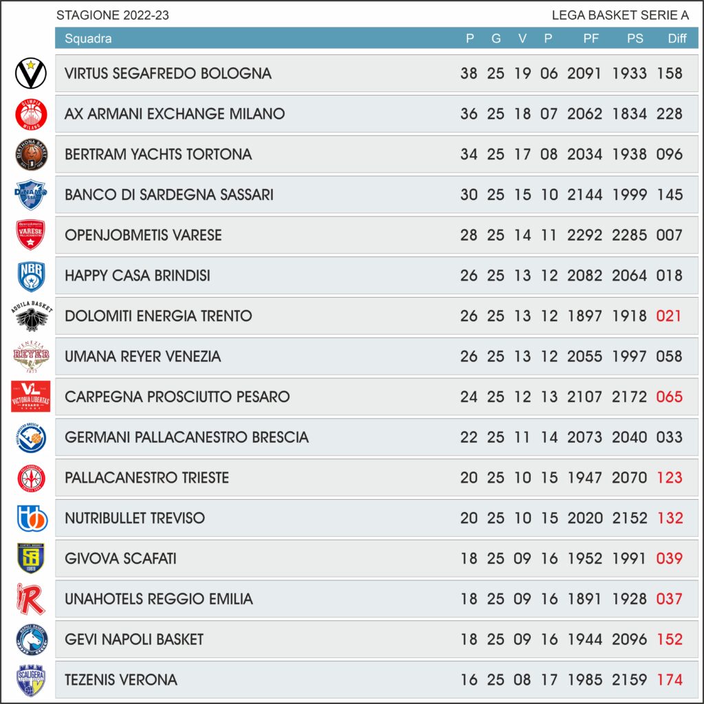 Riscattata contro Napoli la sconfitta contro Trieste e reduce dalla vittoria nel derby di “Euroleague” contro Milano per 89-84, la Virtus Bologna si reimmerge nel campionato contro una Trento reduce da due vittorie con Pesaro e Trieste e sempre più in fiducia in zona playoff. All’andata i felsinei si imposero per 71-64.