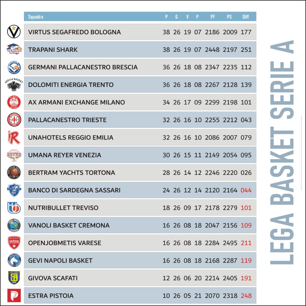Quando mancano quattro giornate alla fine della regular season, la 26.a giornata di LBA ci consegna un duo in testa formato da Trapani e Virtus Bologna. In chiave playoff importanti vittorie di Venezia e Reggio Emilia. In coda colpaccio di Varese che espugna il PalaBarbuto di Napoli. Vediamo cosa è successo in questo interessante turno di campionato