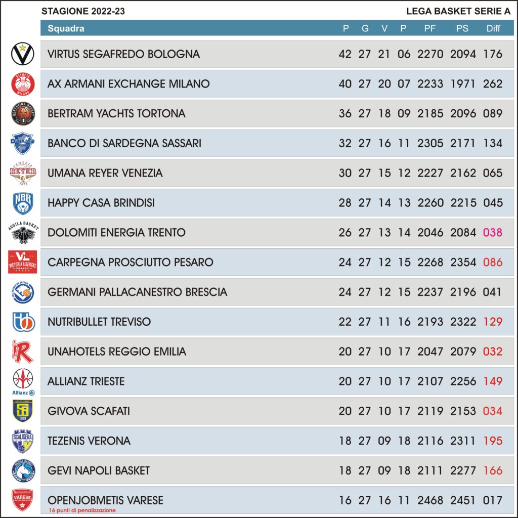Imperativo categorico: non perdere Bologna dal campo visivo. La vicecapolista Milano riceve una Treviso che ha riscattato contro Pesaro quattro stop di fila rendendo la sua classifica più tranquilla. Andata: 93-80 per Milano.