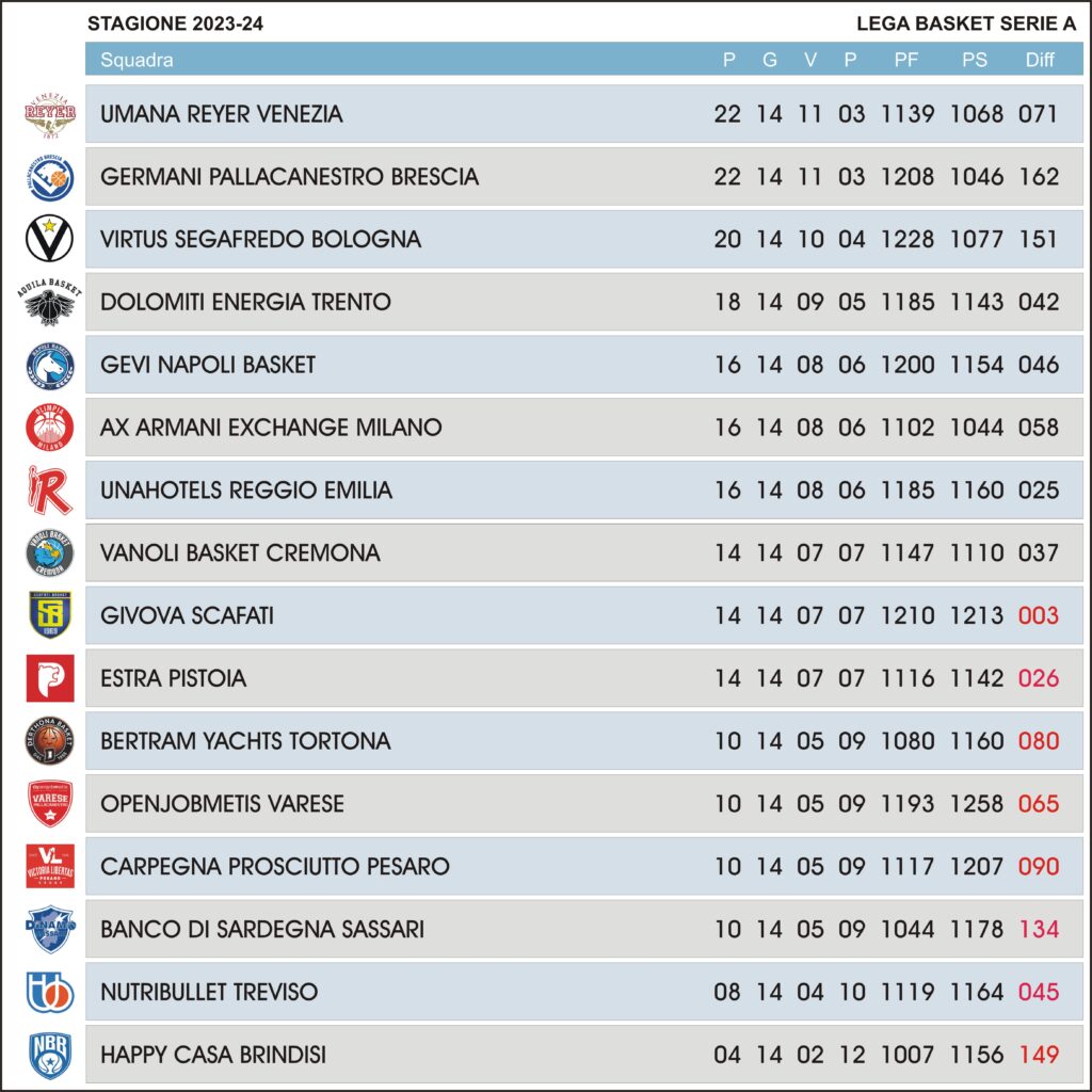 Le due capoliste Venezia e Brescia sfidano, rispettivamente, Napoli e Brindisi. Varese in cerca della terza vittoria di fila sul parquet di Treviso. Derby emiliano tutto da gustare tra Reggiana e Virtus Bologna, sfida d’alta quota Trento- Milano.