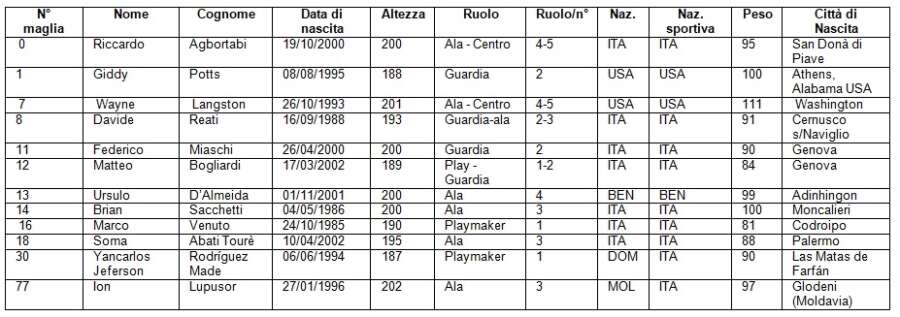 Coadiuvato da Lorenzo Dalmonte e Paolo Scorletti, Michele Carrea avrà a disposizione per il raduno della Blu Basket: Davide Reati, Matteo Bogliardi, Soma Abati Tourè, Ion Lupusor (confermati), Ursulo D’Almeida (di rientro dal prestito a Biella), Marco Venuto, Brian Sacchetti, Giddy Potts, Federico Miaschi, Wayne Langston, Yancarlos Rodríguez e Riccardo Agbortabi (i nuovi). Ai dodici giocatori che faranno ufficialmente parte della rosa della Gruppo Mascio, si aggregheranno agli allenamenti anche Alessandro Amboni, Camara Mamadou e Edoardo Stucchi.