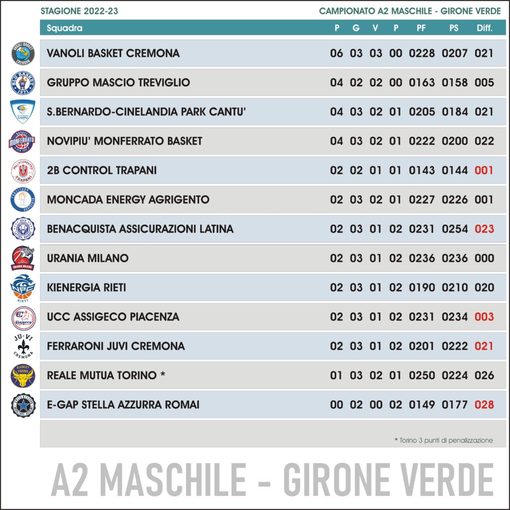 Quarta giornata di campionato in serie A2 maschile con tante partite interessanti. Nel Girone Verde la Vanoli Cremona vola a Latina decisa a mantenere il primato. Derby lombardo d’alta quota tra Cantù e Treviglio. Casale in trasferta a Torino per non perdere contatto dalla vetta. La Stella Azzurra a caccia del primo squillo stagionale. Nel Girone Rosso scontro al vertice tra Udine e Cento con l’altra capolista Forlì impegnata a Chieti. Rimini, Chiusi e Ravenna vogliono sbloccare la casella dello 0 in classifica.