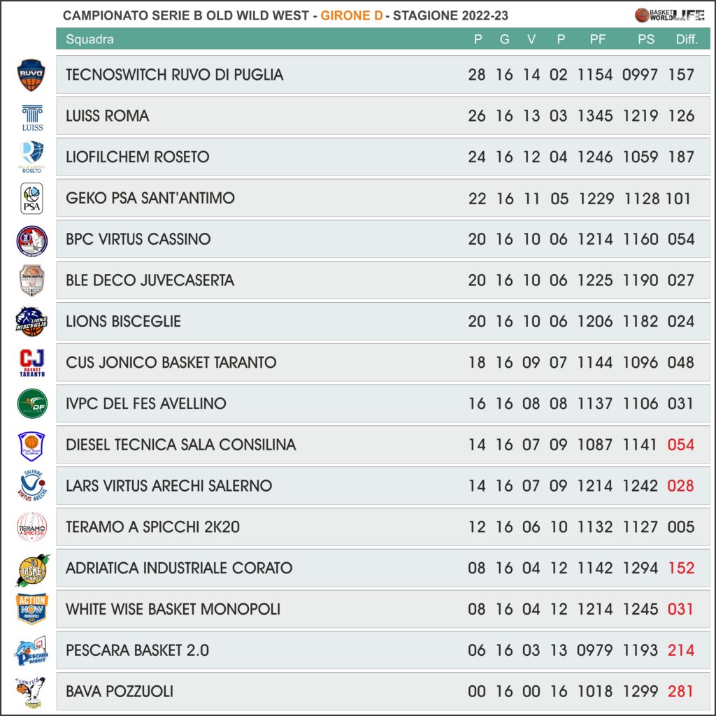 Derby campano non semplice per la quarta forza attualmente del girone, una Sant’Antimo che gioca sul parquet di una Sala Consilina che vuole assolutamente cancellare la pesante battuta d’arresto della scorsa settimana a Teramo. Cassino, Caserta e Bisceglie puntano a restare quantomeno agganciate al quarto posto ma se per i campani e i pugliesi gli impegni non sembrano difficili visto che ospitano rispettivamente Pescara e Corato, la trasferta dei laziali in quel di Salerno rappresenta un ostacolo che, se superato, potrebbe dare grande forza e consapevolezza alla compagine guidata da coach Roberto Russo. Altro derby campano ma stavolta dall’esito scontato con Avellino che non può permettersi passi falsi contro una Pozzuoli ancora ferma a zero vittorie mentre chiude il turno la sfida delicata di bassa classifica tra Monopoli e Teramo con i pugliesi obbligati a vincere per alimentare le speranze di evitare gli ultimi quattro posti.