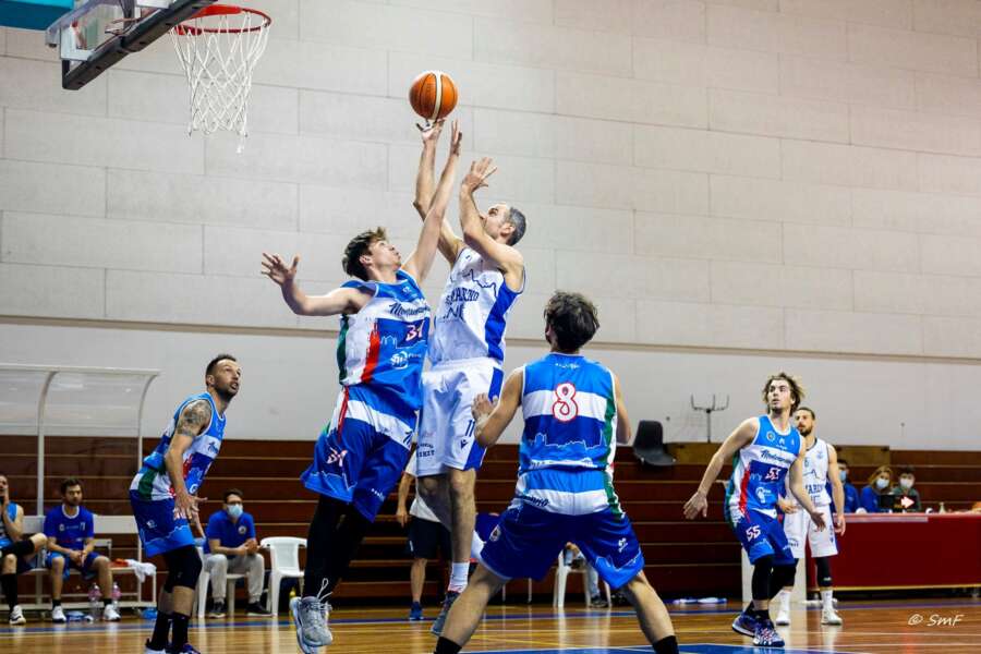 SECONDO TEMPO. Di ritorno dalla pausa lunga i ragazzi di coach Porcarelli provano a sprintare ancora per mettere insieme la fuga decisiva. Capitan Macina è inarrestabile, mette 14 punti con quattro triple nel terzo periodo e la forbice si allarga già al 25’ (51-34), col finale che non cambia l’ordine delle cose (64-48 al 30’). Sul 67-50 del 32’ sembra, se non andata, almeno ottimamente indirizzata. Montemarciano però non molla, trova fluidità dal suo attacco e i Titans non riescono ad essere efficaci come prima. Centanni mette punti importanti, Maiolatesi lo segue e gli ospiti rosicchiano punto su punto fino ad arrivare al -6 a 3’15” dalla sirena (73-67). Momenti e possessi decisivi. Servono nervi saldi, come ad esempio quelli di Giulio Gennari, che mette subito il canestro chiave del +8. A 1’29” dalla fine il contropiede di Raschi vale addirittura il +12 (79-67), col finale che è in controllo.
