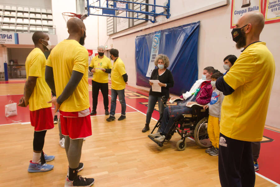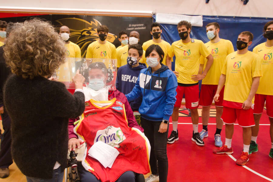 Poi gli applausi e la consegna da parte della squadra di una canotta da gara, firmata da tutti. Fabio, che ha comunicato con l’ausilio di una lavagna speciale che ne traduce i pensieri, segue con attenzione l’evolversi della situazione legata alla capienza degli impianti e ha salutato con una promessa: rivedersi al palazzetto per le partite di campionato dell’OraSì.